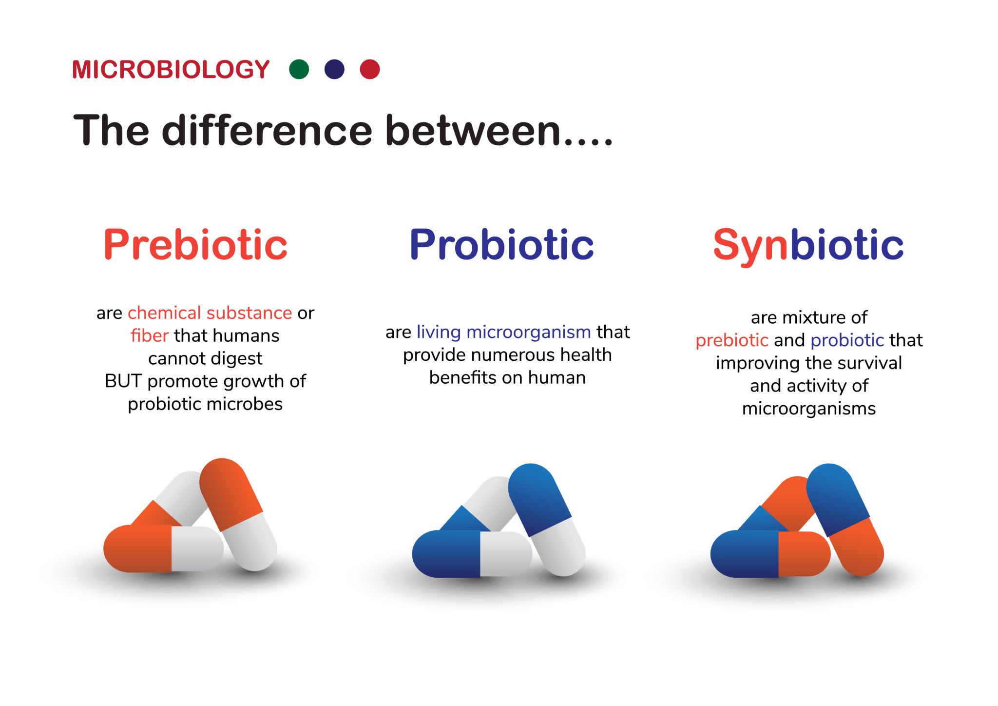 In short: Probiotics are live beneficial bacteria, while prebiotics are the fiber-rich foods that feed those bacteria.